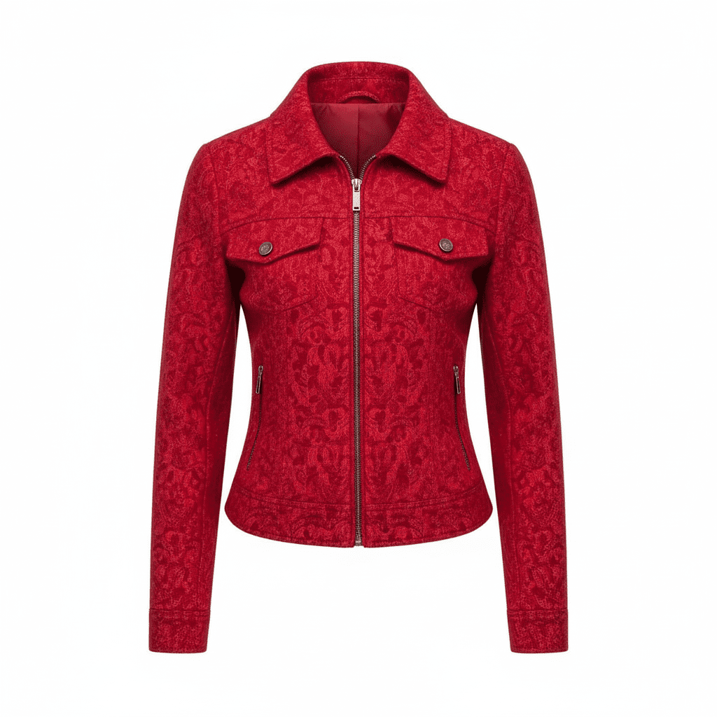 The term “jacquard” refers to a specific type of weaving process where the design is incorporated into the weave itself rather than being stamped or printed on top. This red textured jacket utilizes a jacquard-style tonal pattern running consistently across the surface. This technique offers several benefits: